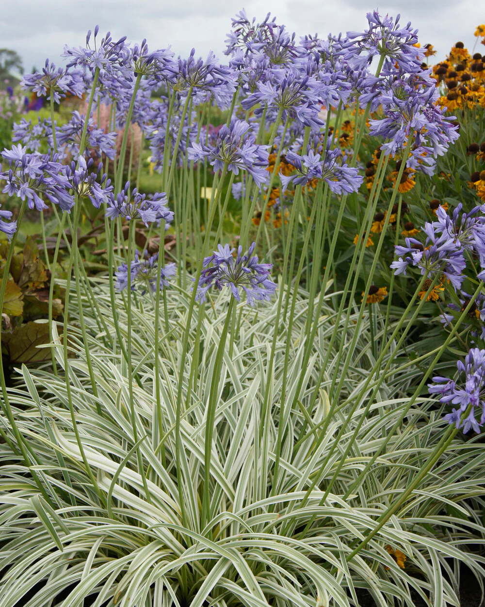 Agapanthus 'Silver Moon' is a stunningly good dwarf Agapanthus, reaching a top height of just 100cm or so. Its outstanding feature is its stripy green-and-white variegated foliage—this sets it apart from all others. 'Silver Moon' is a deciduous Agapanthus, so the leaves emerge each spring, in an attractive clump. To add to this, pretty trumpet-shaped lavender-blue blooms are held in round heads, and contrast beautifully with the foliage. Each bloom has a delicate darker stripe, and long stamens. Blooms are held throughout the summer months, ensuring the plant makes a lovely addition to a mixed border or patio container.