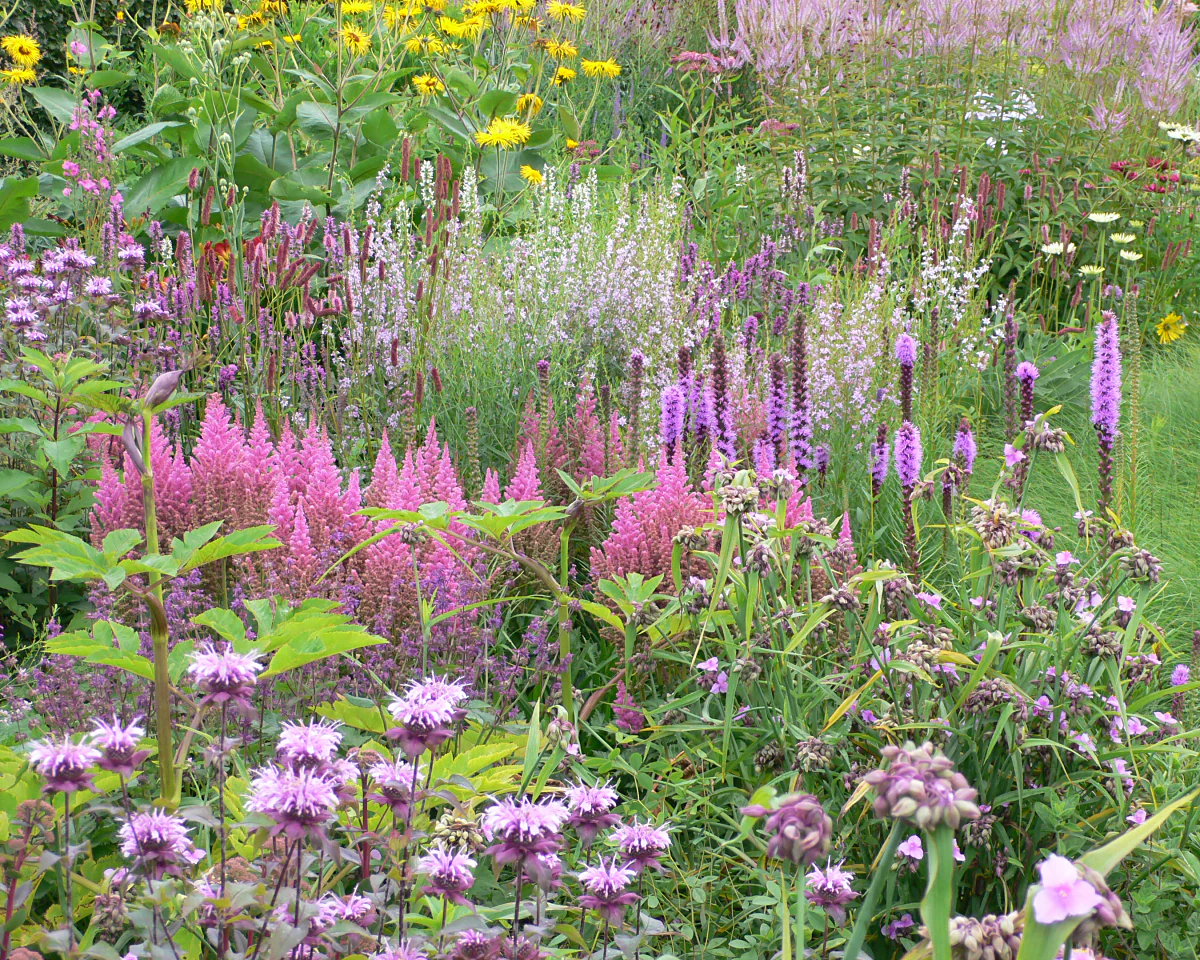 For many years, Astilbe 'Vision in Pink' has been a popular and high-selling Astilbe. Pale pink plumes rise above a dense mound of large, blue-green leaves with a coarse texture. As with all Astilbes in the Visions series, this is a tough, hardy and robust plant. It is a member of chinensis (Chinese) species, which is a later-blooming species useful for extending the flowering season into late summer.