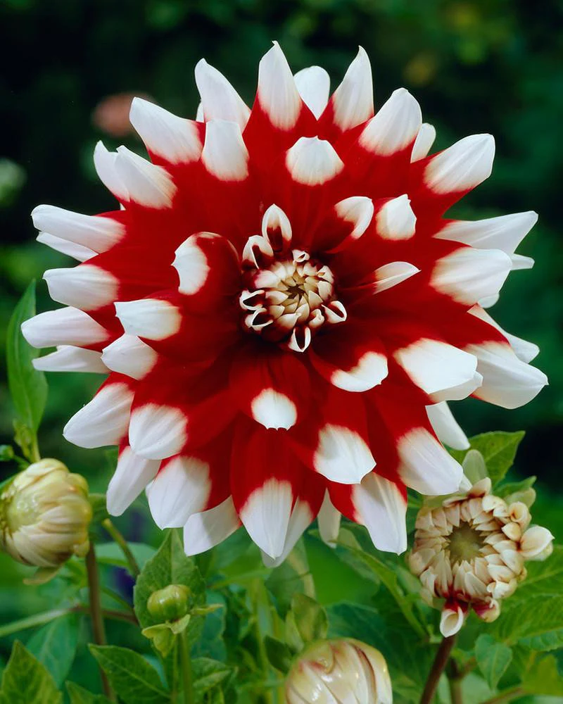 Dahlia 'Duet's medium sized bi-colour 20cm bloom tips its wine red petals with pure white. The petals' edges turn slightly downwards, preventing the collection of rainwater in inclement weather and increasing their ability to stay tall and erect after rain.
