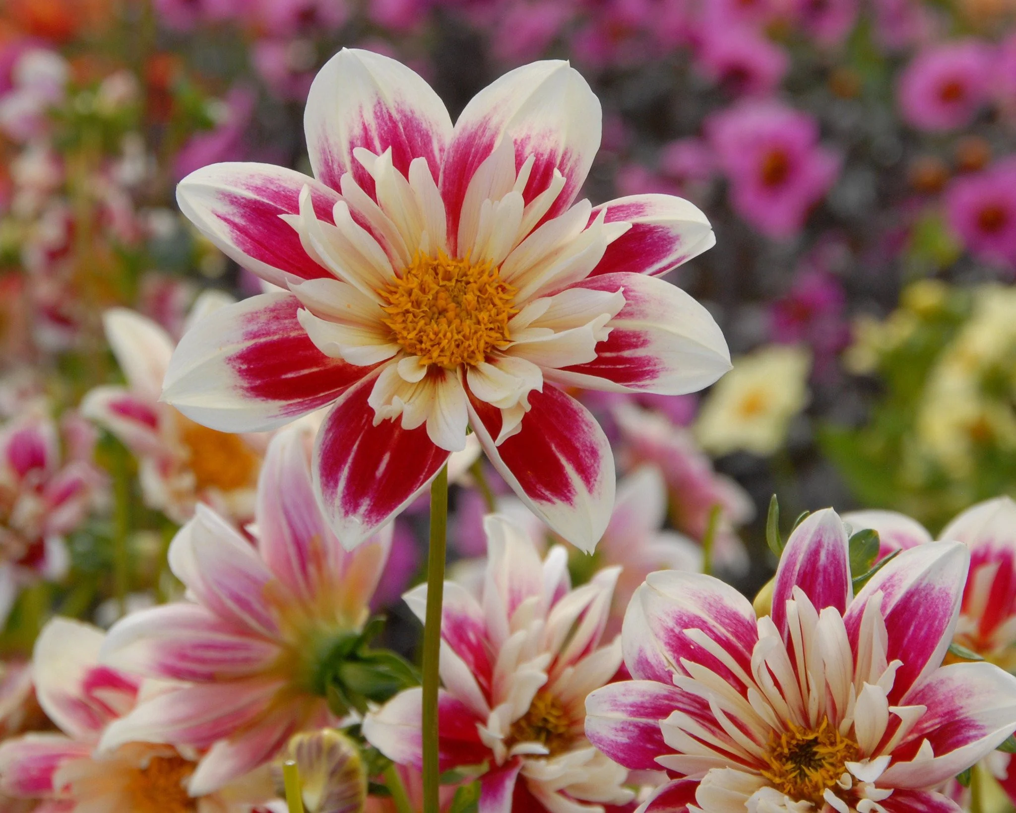 What a charming and colourful flower this is! The Dahlia 'Fashion Monger' could well set a trend in border gardening. Not that it would be an entirely new fashion – a bit retro, in fact, when it’s taken into account this collarette dahlia was introduced in 1955. Dahlia 'Fashion Monger' was popular then and it still is. Its highly contrasting colours and petal structure make for a bloom that will delight in the garden, patio pots, containers or indoor vases. Bright red edged with dark pink is brushed on white to allow to form a background for the creamy white collar of medium length petals that surround a centre made up of golden yellow balls. Flowering time is June till the first frosts.