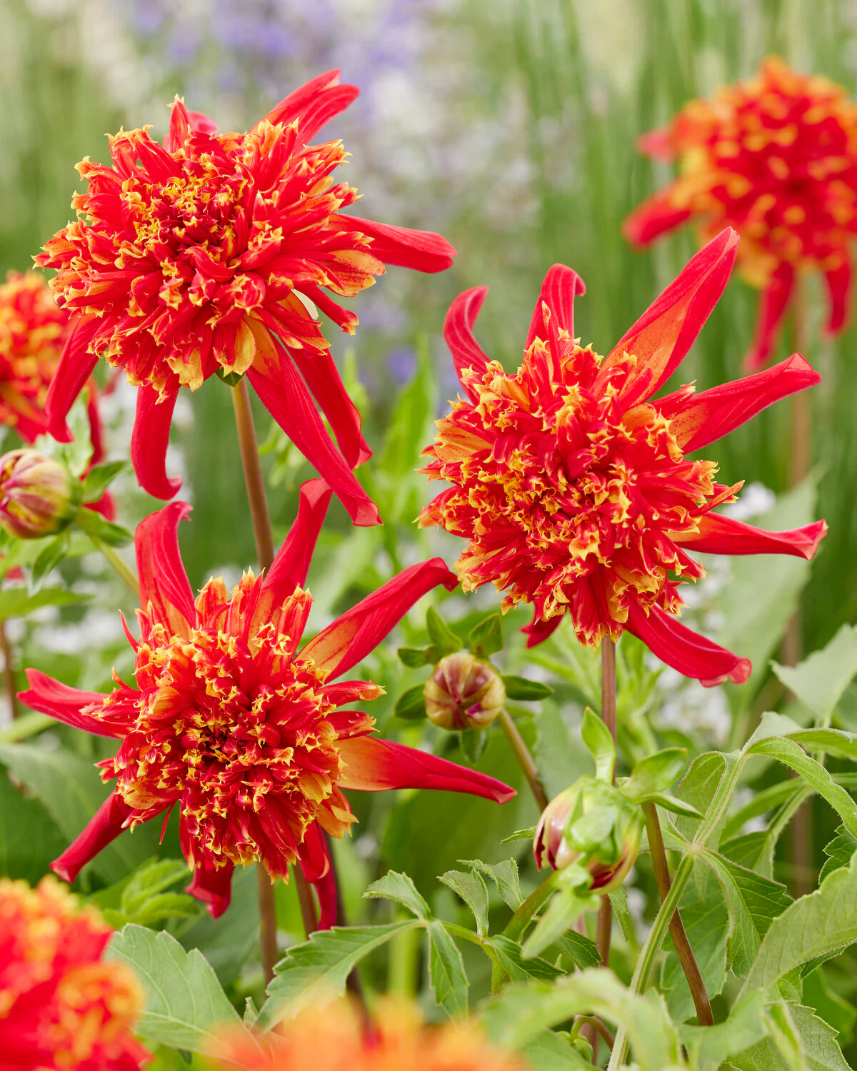 As with all dahlias, Dahlia 'Octopus Sparkle' will bloom all summer long and continue with a big colour hit well into autumn. You can pair it with leafy plants like cannas and colocasias to introduce a bold colour accent to a lush jungle theme, or grow it in borders among other summer blooms—Dahlia 'Octopus Sparkle' looks particularly good with a purple-flowered neighbour like Salvia 'Caradonna' or Verbena bonariensis, and of course with other fiery shades. These bright blooms can also be used to make fun boho bouquets—there’ll be plenty to pick so be sure to bring some exotic colour indoors to enjoy too!