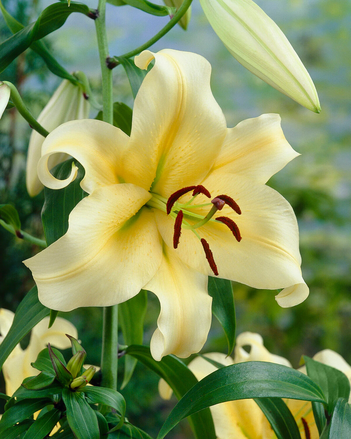 Transform your garden into a romantic retreat with the breathtaking Lily 'Honeymoon'. This strikingly tall, deciduous bulbous perennial is a true statement plant, adding height, fragrance, and charm to your summer display. Its strap-like, dark green leaves create a lush base, but the real stars are the large, star-shaped blooms. In a soft, pale golden yellow hue, the flowers of Lilium 'Honeymoon' exude an irresistible fragrance, perfect for filling warm summer evenings with a touch of magic. Reaching impressive heights, this lily commands attention in borders and beds, where its elegant silhouette stands out beautifully. For those who love cut flowers, Lily 'Honeymoon'brings a luxurious touch to indoor arrangements.